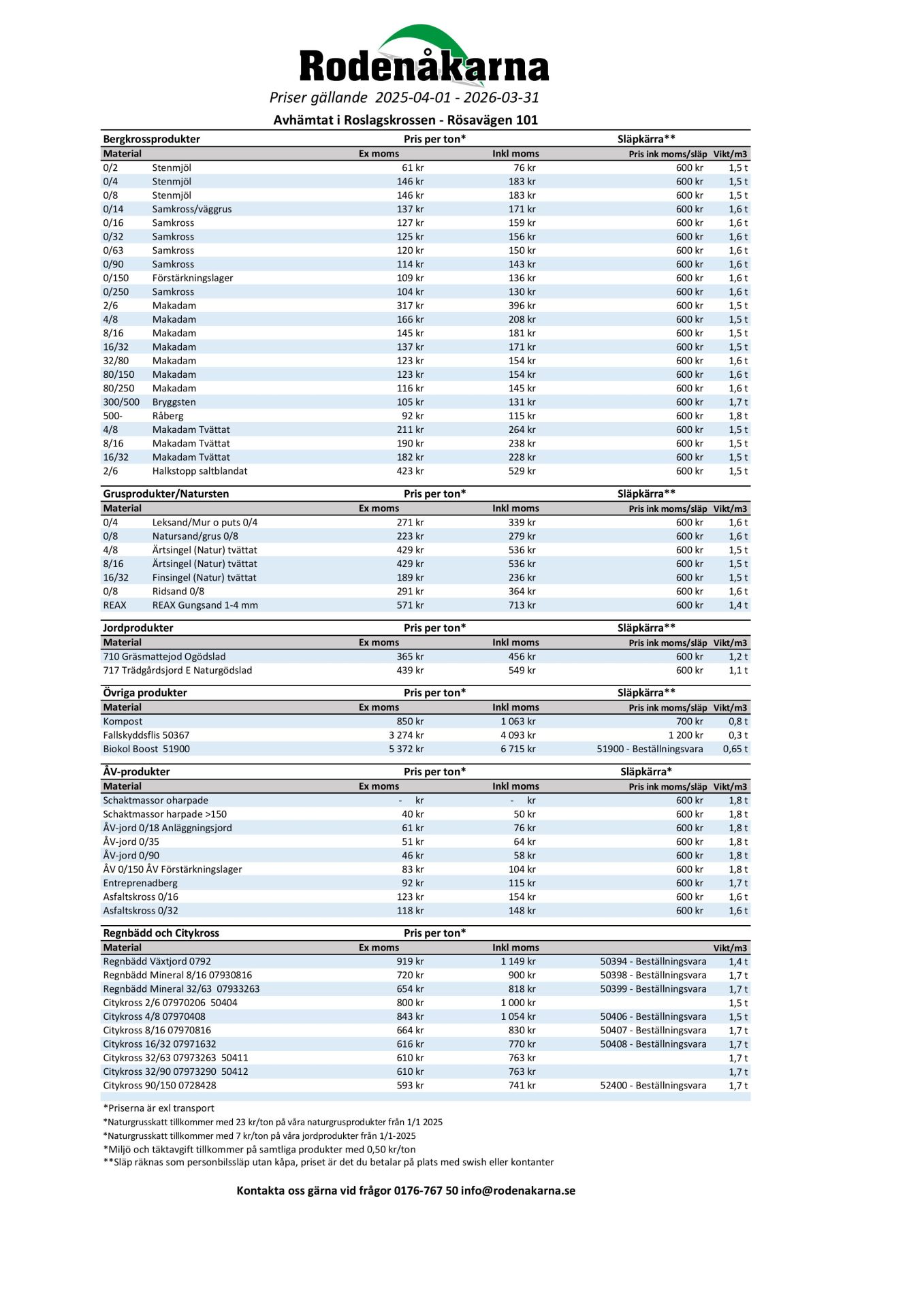 Nedan finner du gällande prislista för Rodenåkarna för perioden 2025-04-01 – 2026-03-31